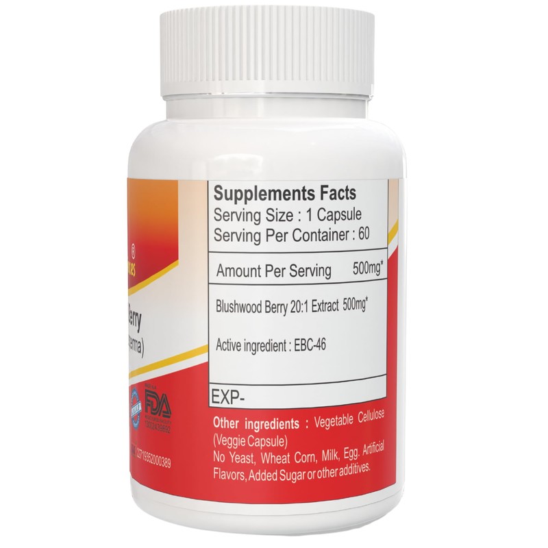 Mfg not older than 45 days Exp 2 Years from Mfg GlossiLife Sciences Blushwood Berry 20:1 capsule EBC-46 Capsule Size: 500mg All of our extracts are FREE of any type of fillers or additives like magnesium stearates, gelatin, artificial colors, artificial flavors or preservatives. In order to provide consistency in quality, all of our products undergo following tests: Microbiology Analysis Titration/Assay with HPLC / Gravimetry, Residual Solvent Analysis with GC-HS, Heavy Metal Testing with AAS, Impurity Profiling and Stability testing.