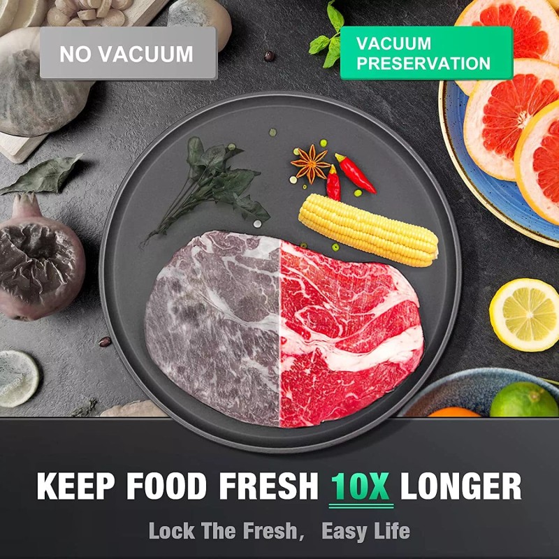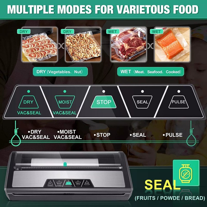 - 3 Modes for Multi-function: This vacuum sealer machine have five buttons for three modes--dry moist and soft. These modes can used for all your need in daily life. Such as beef fish seadfood nuts biscut vegetables and fruits. Bring you a fresh life.