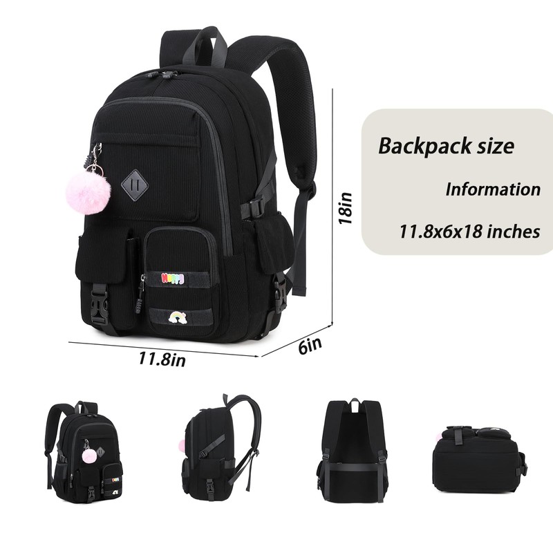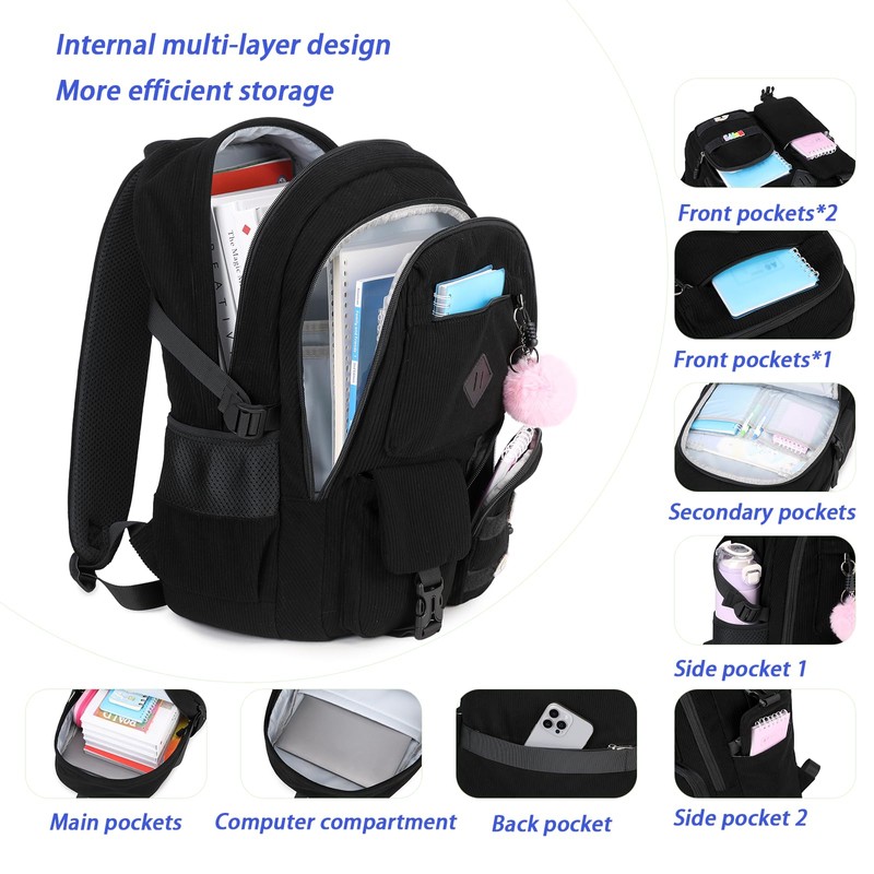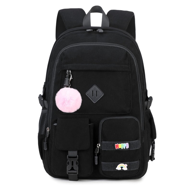BLUWEI Girls Laptop Backpack Corduroy Bookbag For Teen Big Studen School Bag Durable Travel Daypack (1black)