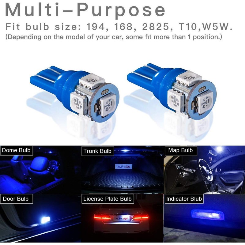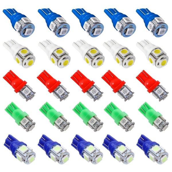 • Pack of 25PCS 194 W5W Replacement Bulbs,Operating Voltage 12V-DC,Wattage: 0.8W/Bulb,Luminous Flux: 80Lum/bulb,Color: Mix color 5PCS Blue +5PCS White + 5PCS Red + 5PCS Green + 5PCS Ice Blue