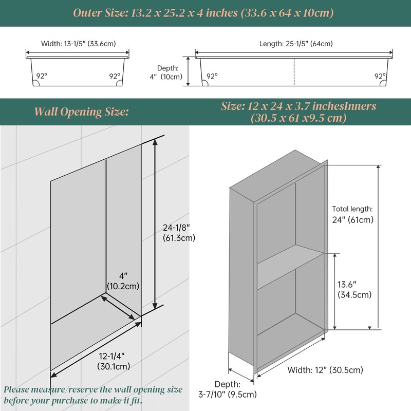 - 【 SIZING INFORMATION】- Outer Size:33.6 x 64 x 10cm/ 13.25" Width x 25.25" Height x 4" Depth. Inner Size: 30.5 x 61 x 10cm/ 12"Width x 24" Height x 4"Depth. Deep enough for almost any bathroom product .