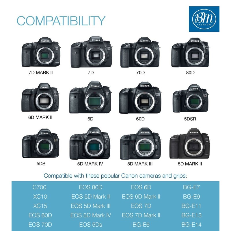 - COMPATIBILITY - Battery is compatible with these following popular Canon cameras and grips: C700 / XC10 / XC15 / EOS R / EOS R5 / EOS 60D / EOS 70D / EOS 80D / EOS 90D / EOS 5D Mark II / EOS 5D Mark III / EOS 5D Mark IV / EOS 5Ds / EOS 6D / EOS 6D Mark II / EOS 7D / EOS 7D Mark II / BG-E6 / BG-E7 / BG-E9 / BG-E11 / BG-E13 / BG-E14
