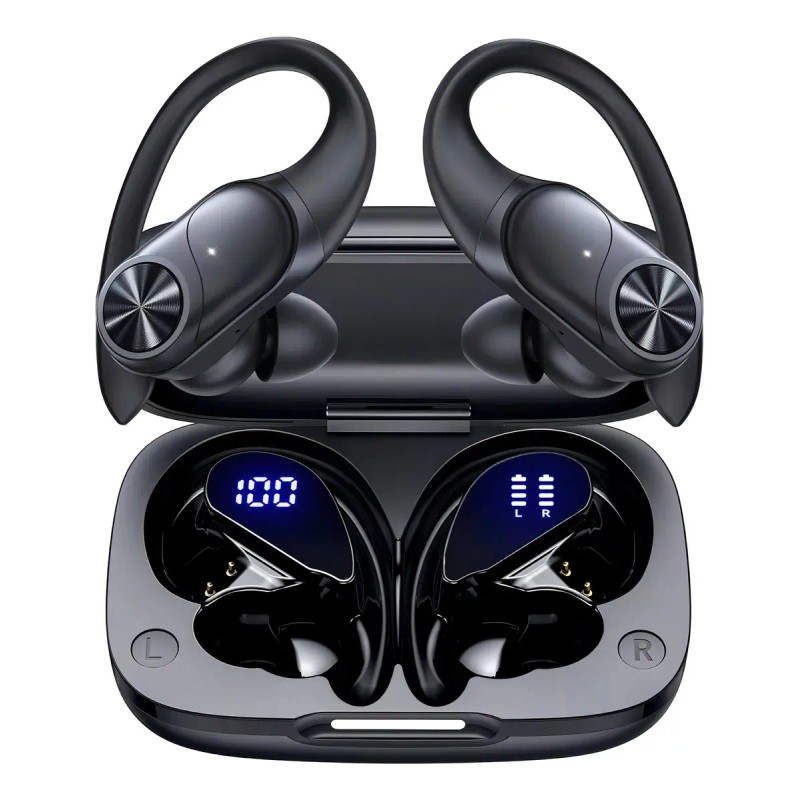 BMANI T60 Audífonos Bluetooth Deportivos, IPX7 Impermeable, Carga Inalámbrica, Pantalla Digital, 80H Autonomía, Cómodo para Oreja Negro