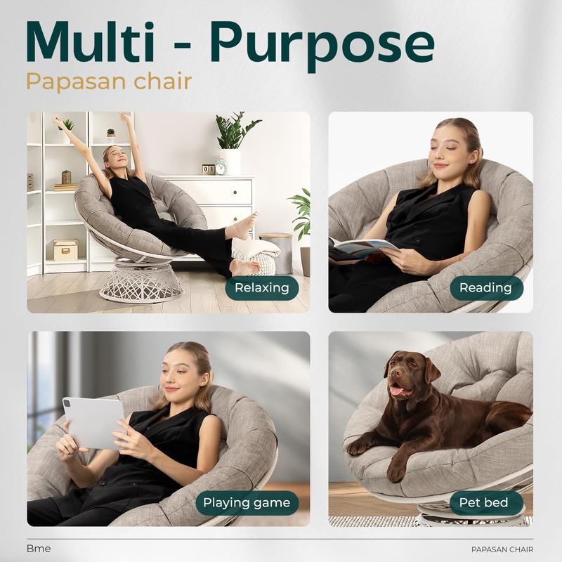 Bme 40" Ergonomic Wicker Papasan Chair with Soft Thick Density Fabric Cushion, High Capacity Steel Frame, 360 Degree Swivel for Living, Bedroom, Reading Room, Lounge