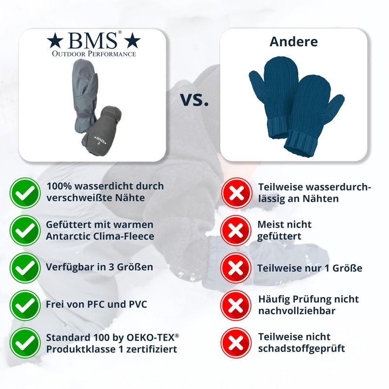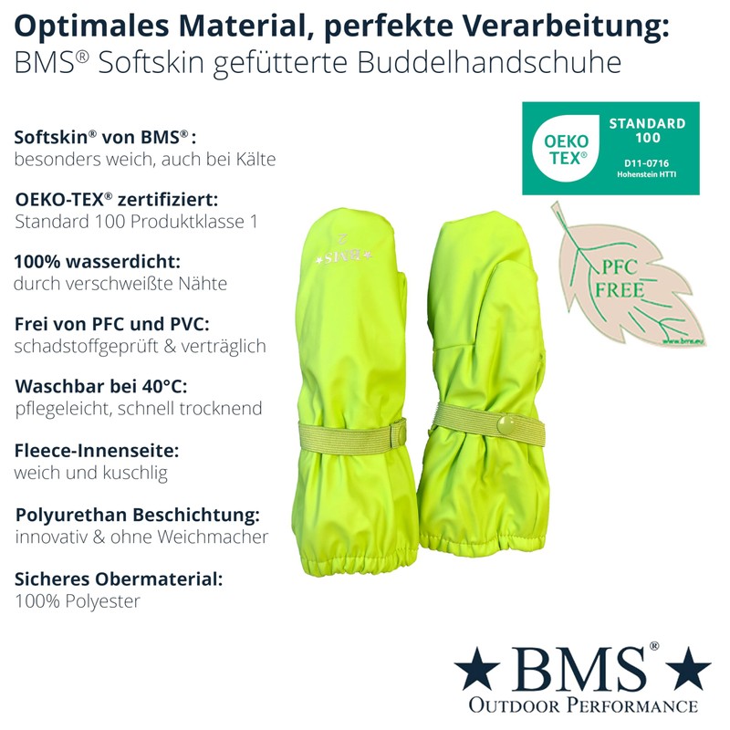 - Functional BMS quality: these children's gloves are 100% waterproof thanks to taped seams, slightly breathable, 100% polyester, particularly durable, produced and certified according to Standard 100 by Oeko-Tex product class 1 with the strictest requirements.