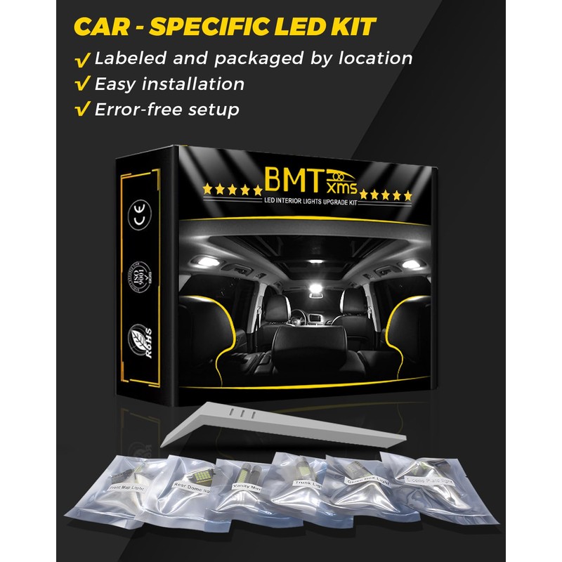 - EASY INSTALLATION -- No error code, no modifications required. Comes with a handy pry tool for removal. Each bulb is carefully packaged and labeled for every specific location within the vehicle.