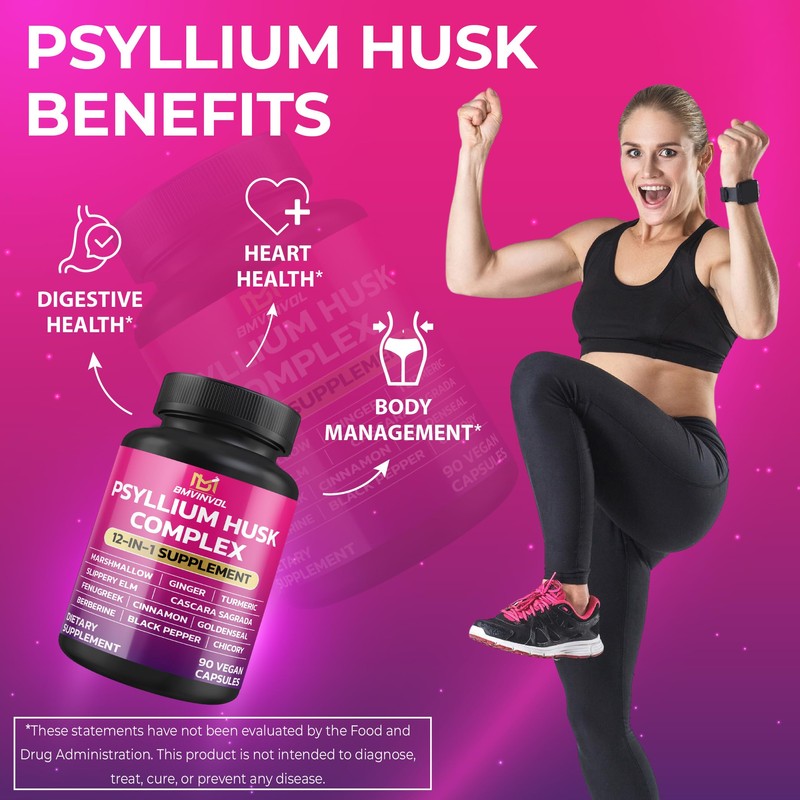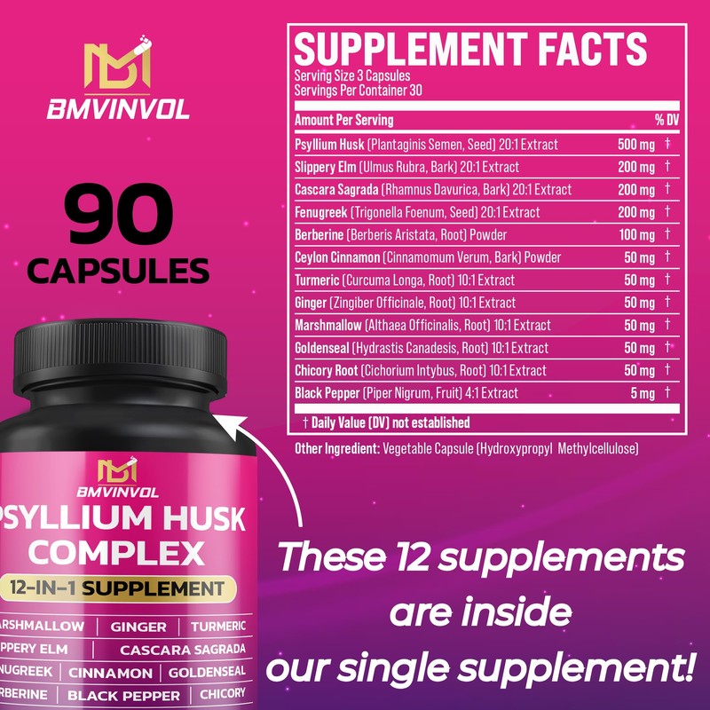 BMVINVOL Psyllium Husk, Slippery Elm, Cascara Sagrada, Fenugreek, Berberine, Cinnamon, Turmeric + 5 Mores - Immune Support & Digestive Health Supplement - 90 Capsules