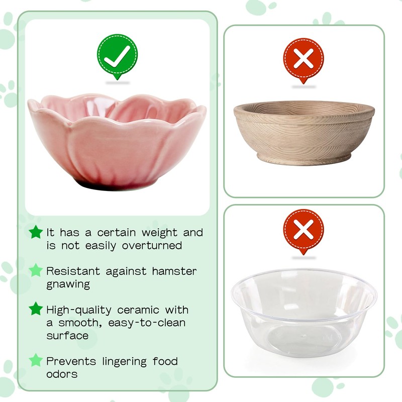 Weighing in at 125grams and with dimensions of 3.3x3.3 inches (8.5x8.5cm), this anti-turning food & water dish is sturdy enough to withstand tipping while providing ample space for your hamster to enjoy their meals. Flower gerbil bowl compact size means it won't take up much space, making it suitable for any corner of your pet's domain