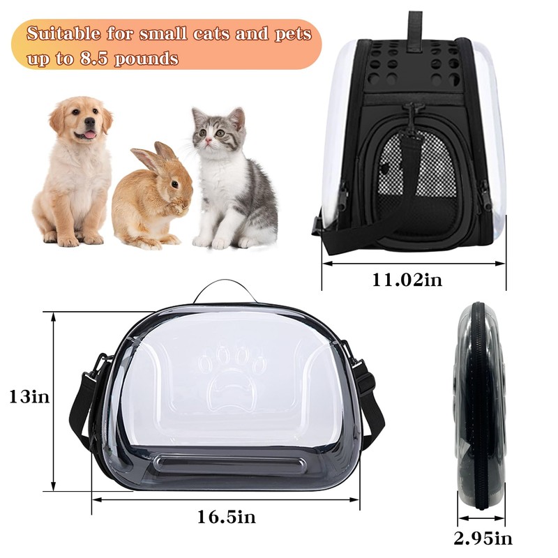 - Size: Clear pet carrier bag is 16.53x11.22x12.99 inches when opened, 16.53x2.95x12.99 inches when folded, suitable for carrying small cats, rabbits guinea pig and hedgehog for funning, walking, shopping, bathing