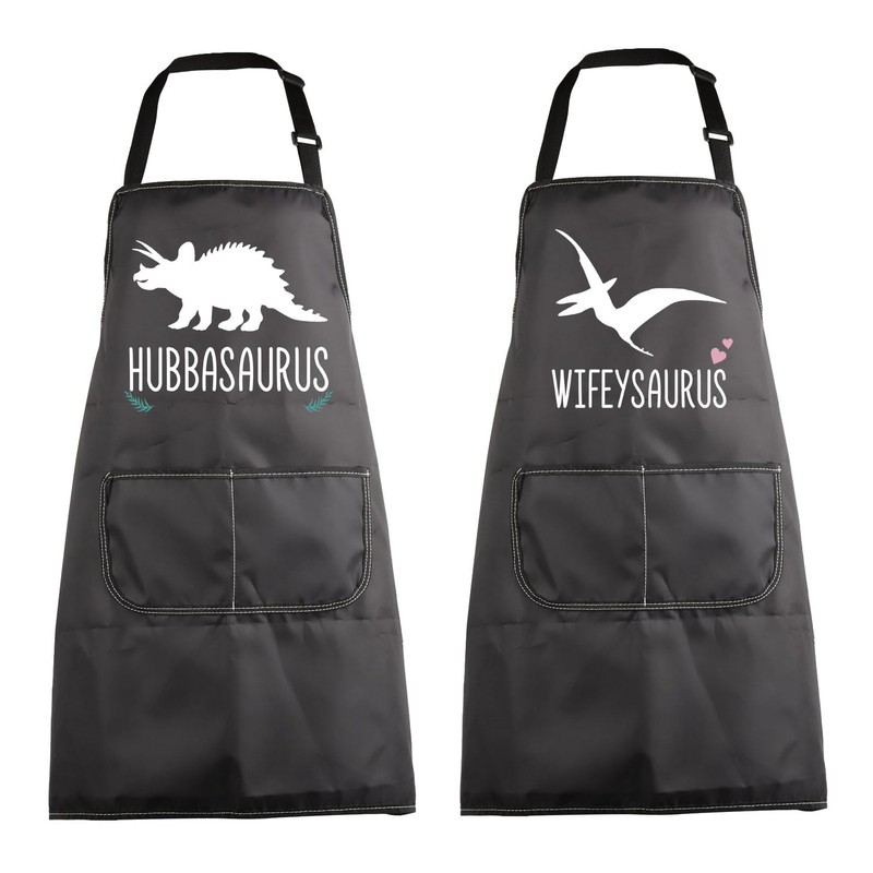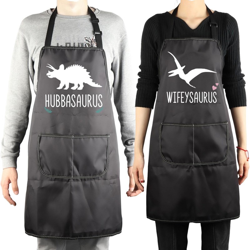 - HUBBASAURUS Apron+WIFEYSAURUS Apron fabric is thick, wear-resistant, durable, non-pilling and easy to clean, they are effectively to keep your clothes clean and dry. Awesome gifts for husband wife bridal shower gifts, wedding gifts for the couple engagement gifts, wedding anniversary gifts, couples wedding aprons for newlyweds, funny bride groom gifts.