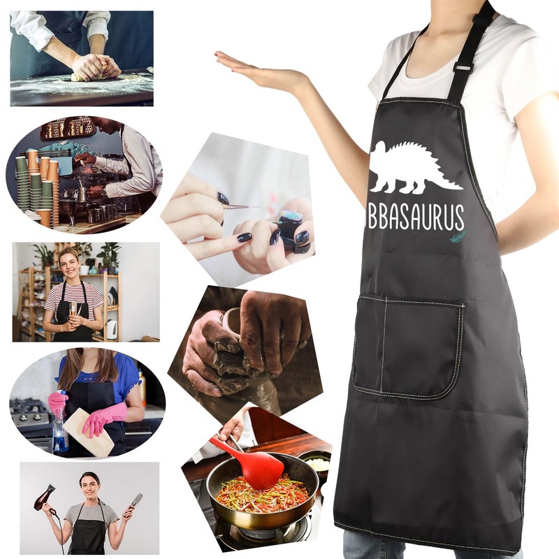 - [UNIVERSAL SIZE]: HUBBASAURUS Apron+WIFEYSAURUS Apron 28.35 inches in length, about 26.77 inches in width, and the waist strap is about 17.72 inches. The 2 pockets are 5.5 inches +5.5 inches in length, about 6.5 inches in width.