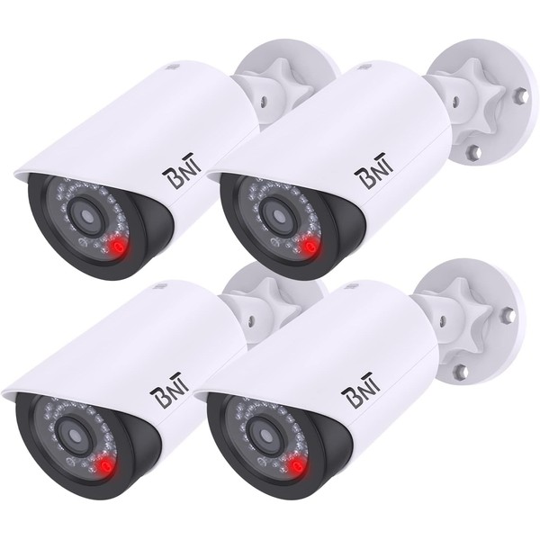 BNT Dummy Fake Security Camera, with One Red LED Light at Night, for Home and Businesses Security Indoor/Outdoor (4 Pack, White)