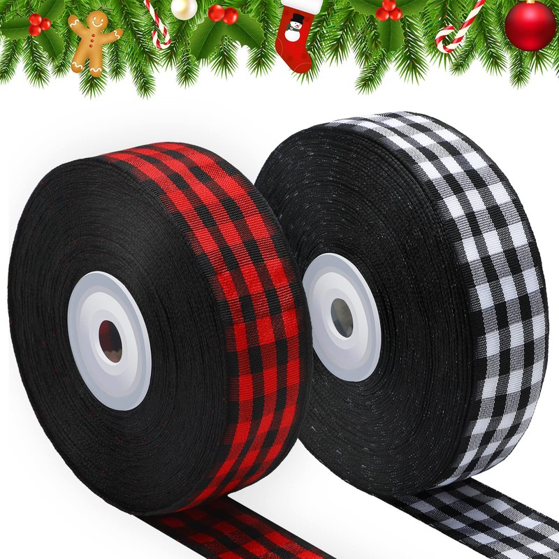 Boao 2 Rolls Christmas Buffalo Plaid Ribbon Christmas Wrapping Ribbon Wired Edge Burlap Check Gingham Wreath Tree Decor(Red Black and White Black, 1 Inch Wide, 60 Yard)