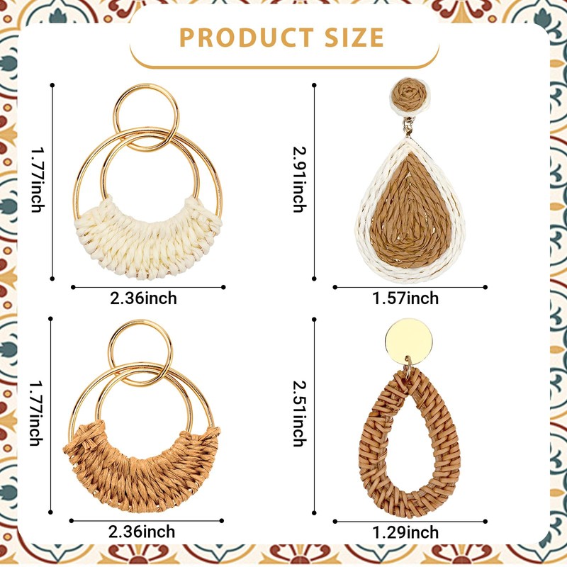 In addition, this tan earrings for women set is also a good choice for conveying emotions. You can also give these rattan earrings to your girlfriend, wife, mother, making the boho earrings thoughtful and practical gifts for Valentine's Day, Mother's Day, birthdays, Christmas, or any other commemorative holiday. Choose this 4-pair boho earrings for women set to fill your ears with freedom and romance, showcasing your unique charm!