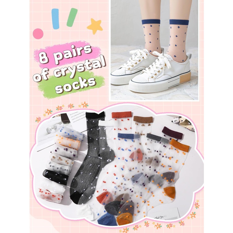 - Fashion Design: Sheer socks women are designed with classic polka dot design, which is both fashionable and layered, and 8 colors are selected to meet diverse style requirements. The sock body is elastic, one size fits most women and girls, and transparent socks for women fit the foot well and is not easy to fall off. Whether exercise or daily walking, you can easily show your fashion taste and become the focus of everyone