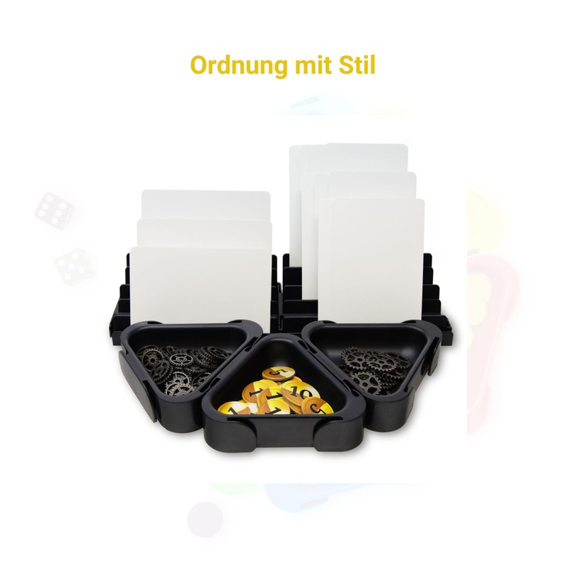 The Chameleon system consists of durable resource trays and card holders equipped with an innovative plug-in connection system. This allows you to individually adapt the bowls and holders to your gaming needs, whether for strategic games such as Dune Empire or Quacksalber from Quedlinburg. The rounded corners of the trays make removing tokens, coins and other playing materials particularly easy and convenient.