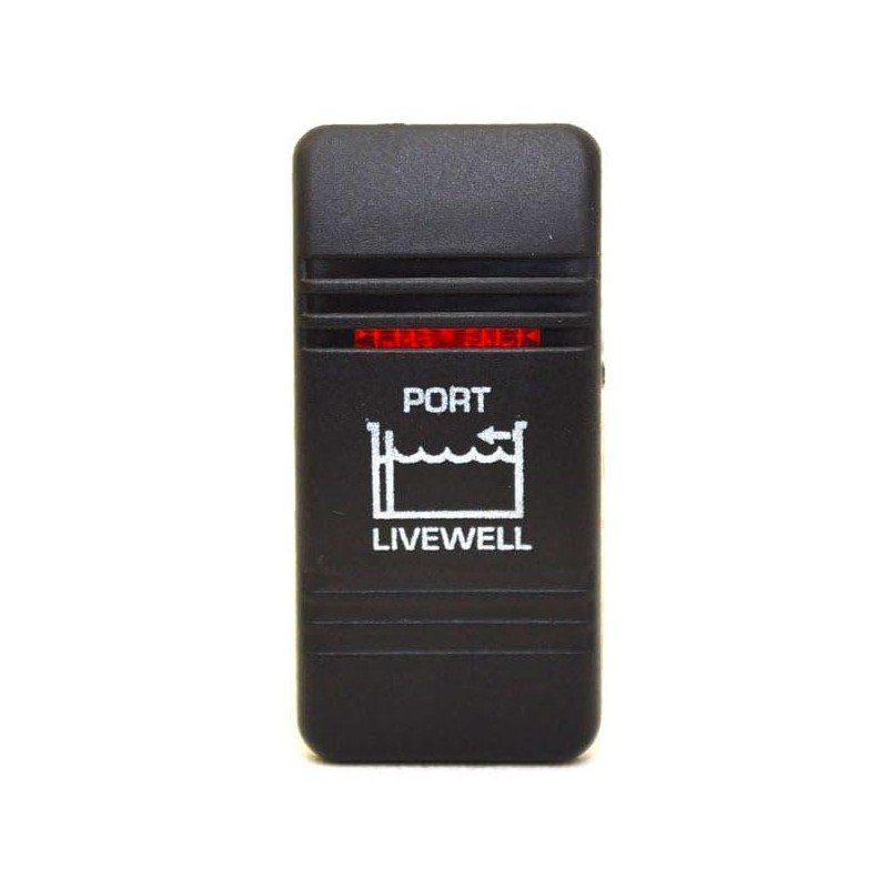 This rocker switch is constructed out of marine grade plastic, with a textured black body. This switch plate also has "Port / Livewell" in white lettering with (1) red illumination panel and measures 2" L x 1 7/8" W x 1/2" H overall.