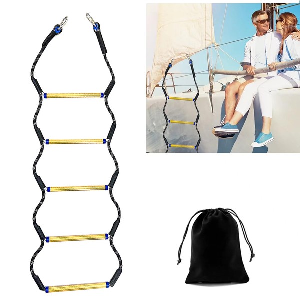 - [ Widely Use ] - This boat rope ladder is a practical tool, built with safe strong durability material with UV resistant polyester, it can hold up in either fresh or salt water. You can attach it to your swim deck, railing and board, it's great to help you get back into the boat, ski boat, raft, kayak, inflatable dinghy float, assist boat, sailboat, jet ski, canoe and motorboat easily.