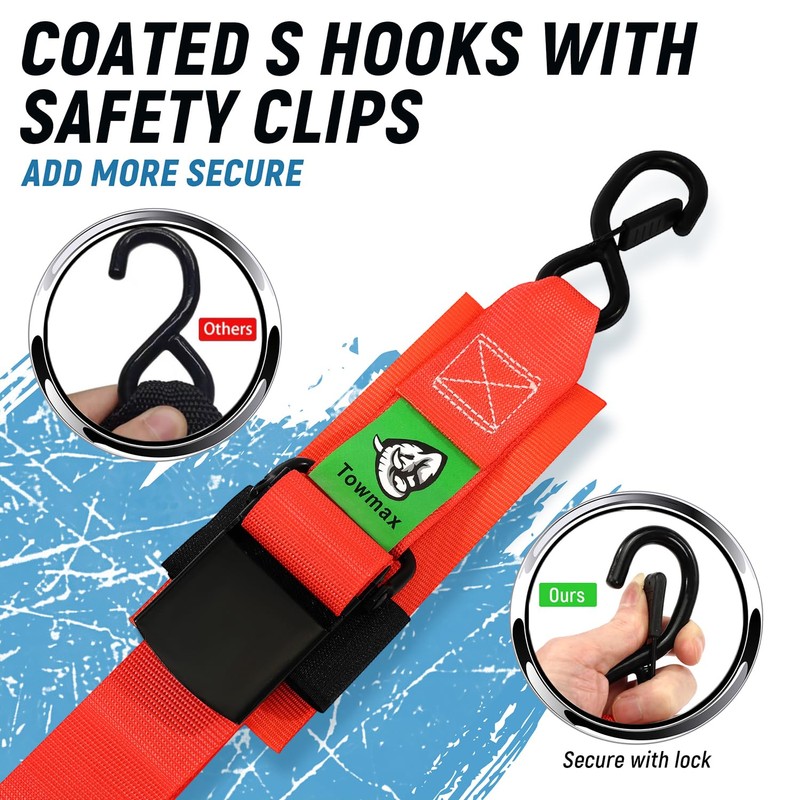 - HIGH QUALITY MATERIAL: Towmax boat tie down straps build tough with heavy-duty stitching and solid hardware, thickened PP material with high density webbing technic, maintain excellent performance even in harsh marine environment