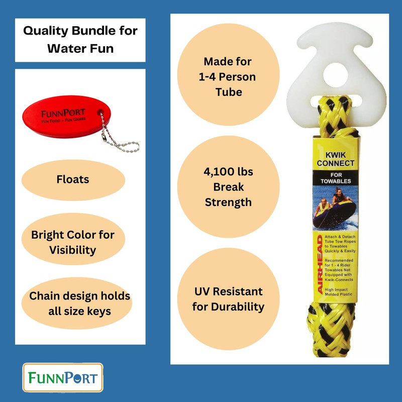 - Bundle: has FunnPort Floating key chain for boating and Airhead Kwik Connect rope. Floating keychain and tow rope for tubing are boat accessories and also useful for jetski and fishing float tube.