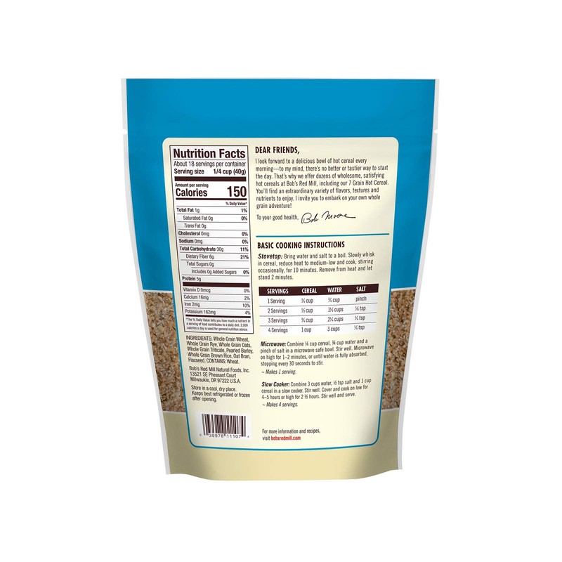 Bob's Red Mill 7 Grain hot cereal is a delicious way to start your day with a healthy breakfast. We've combined 7 of our favorite grains (wheat, rye, oats, triticale, barley, brown rice, and oat bran) with Flaxseed Meal to create this blend, bringing 6g of protein, 6g Dietary Fiber, and 37g whole grains to each serving! Prepared on the stove or microwave, our 7 Grain hot cereal has a creamy texture that's sure to please. Top with your favorite sweet or savory toppings such as pecans and maple syrup or fried egg and chili garlic sauce!