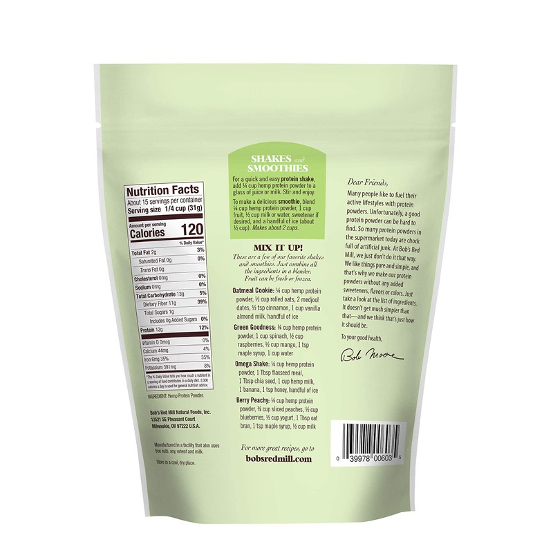 Give your morning a plant-based boost with Bob's Red Mill Hemp Protein Powder. Our recipe is pure and simple, with one of nature's best plant proteins--complete with essential amino acids and packed with fiber. Easy to mix into a quick and delicious snack, and a tasty addition to yogurt, hot cereal, pancakes and baked goods. You can even substitute up to a quarter of the flour in your favorite baked good recipes to sneak in a little more protein. Deliciously simple and naturally nutritious, our Hemp Protein Powder is an excellent way to nourish your day.