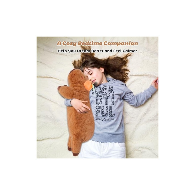 Our cute stuffed animal is not just a cute and cuddly companion, but also a versatile stuffed capybara for relaxation and comfort. The innovative design includes a bag on the back of the stuffed capybara bear, which allows it to serve a dual purpose. When the bag is inserted, the toy becomes a soft and huggable stuffed animal, perfect for providing comfort. Its soft fur and gentle weight offer a sense of security and calmness, making it an ideal cuddle buddy for both children and adults. On the other hand, when you need a quick pillow for a nap or some rest, simply remove the bag inside from the big capybara stuffed animal's back. Instantly, it transforms into a comfortable and supportive pillow. The plush material ensures a gentle touch against your skin. This feature makes our plush stuffed animal a practical and multi-functional addition to any home, providing both emotional comfort and physical support whenever needed.