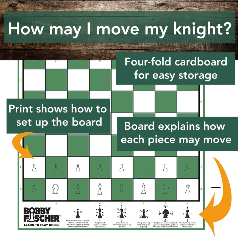 - CHESS BOARD: Images on board show proper chess piece set up and allowed chess piece moves in rank and file. Algebraic notation for teaching. Quarter-fold cardboard folds up for easy board game storage