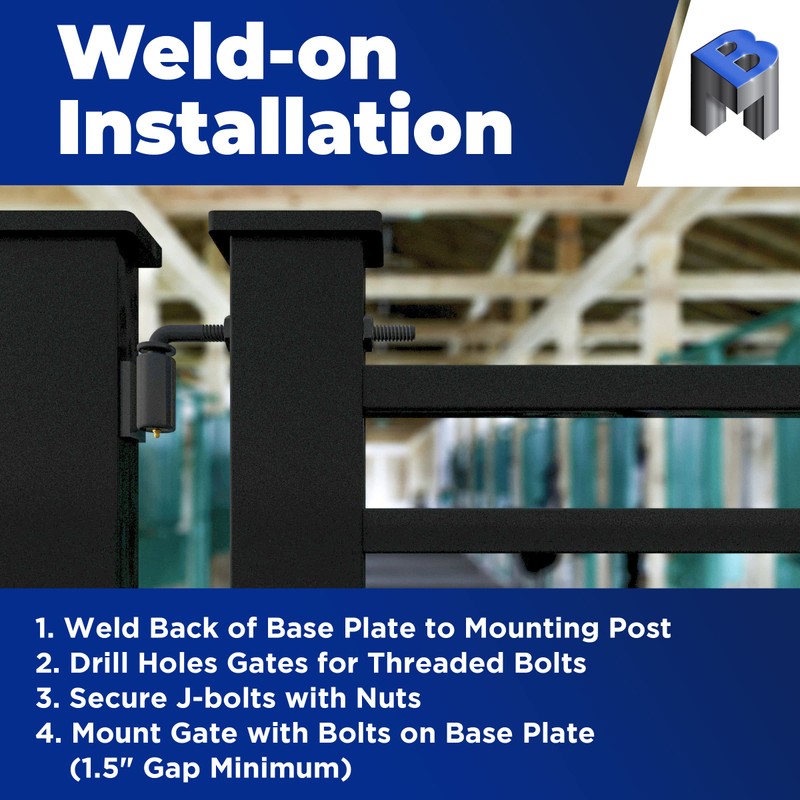 - EASY TO INSTALL - Weld the flat back of the base plate to the post. Drill a hole through the gate and secure it to the bolt with nuts. Mount the weld on hinges with the bolt oriented upwards, leaving at least a 1.5” gap between the post and gate.