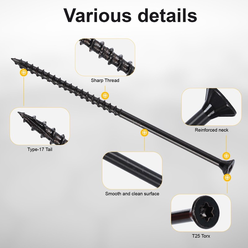 - 【SURFACE TREATMENT】Deck screws are made of high quality 1022A carbon steel. After heat treatment, galvanizing, and black ceramic coating, the surface is smooth and corrosion resistant.