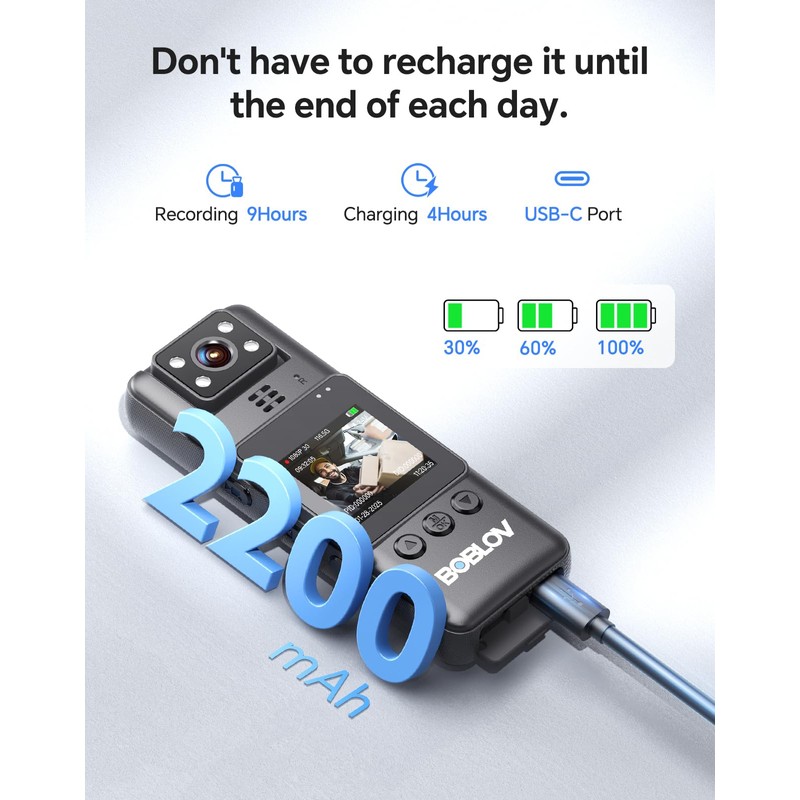 - Impressive 9-Hour Battery Life & Night Vision Features: Enjoy up to 9 hours of continuous recording in day on a single charge with 2200mAh battery. The USB-C interface ensures fast charging, so you can power up quickly and be ready for extended use. Perfect for work, travel, and more! Plus, with 4 IR lights for night vision enabled, the body camera captures clear footage and 5 hours recording in low-light situations, making it ideal for late-night walks, evening bike rides, or any dimly lit environment.