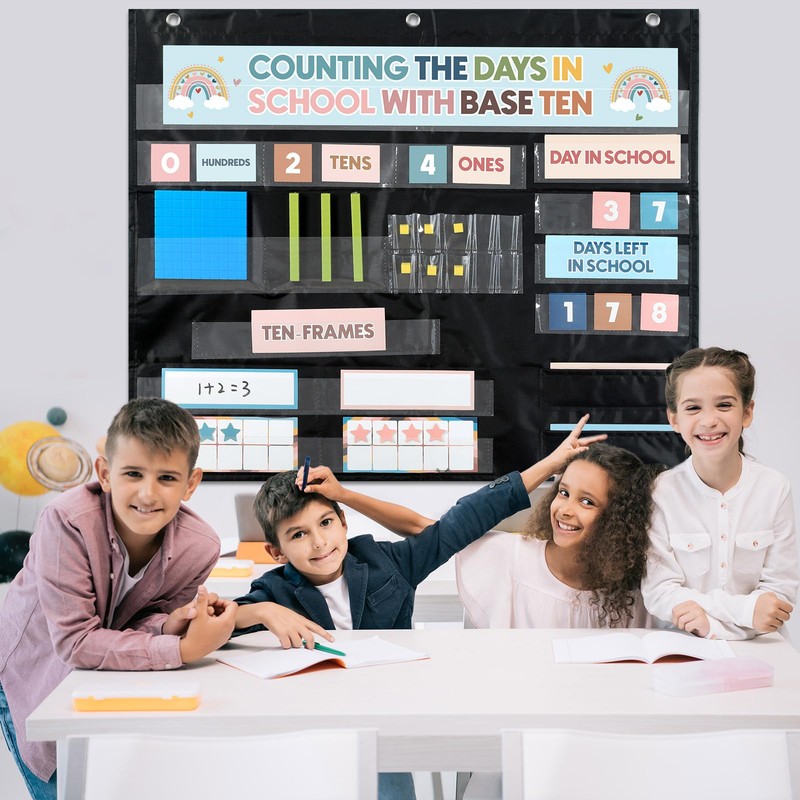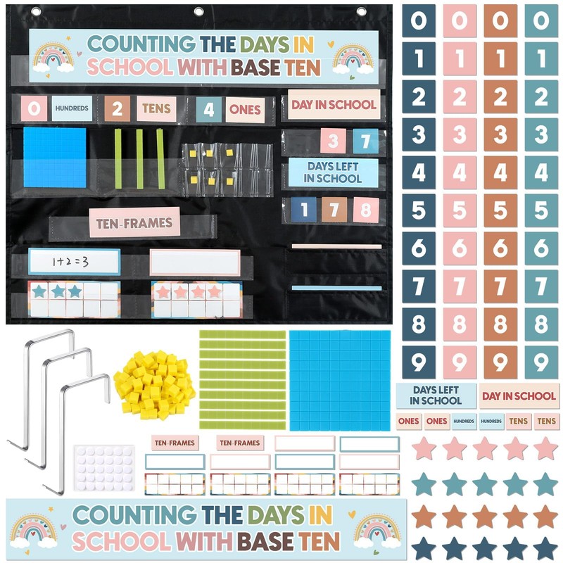 Boho Back to School Counting The Days with Base Ten Pocket Chart Place Value Teaching Materials Counting Pocket Chart for Kids Toddler Learning Activities Classroom Bulletin Board Home Decor