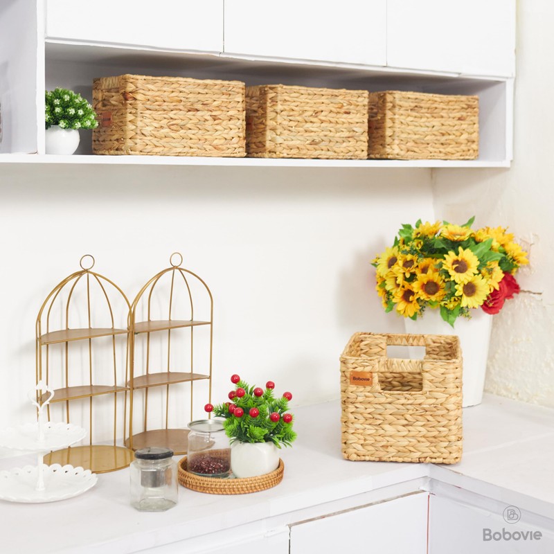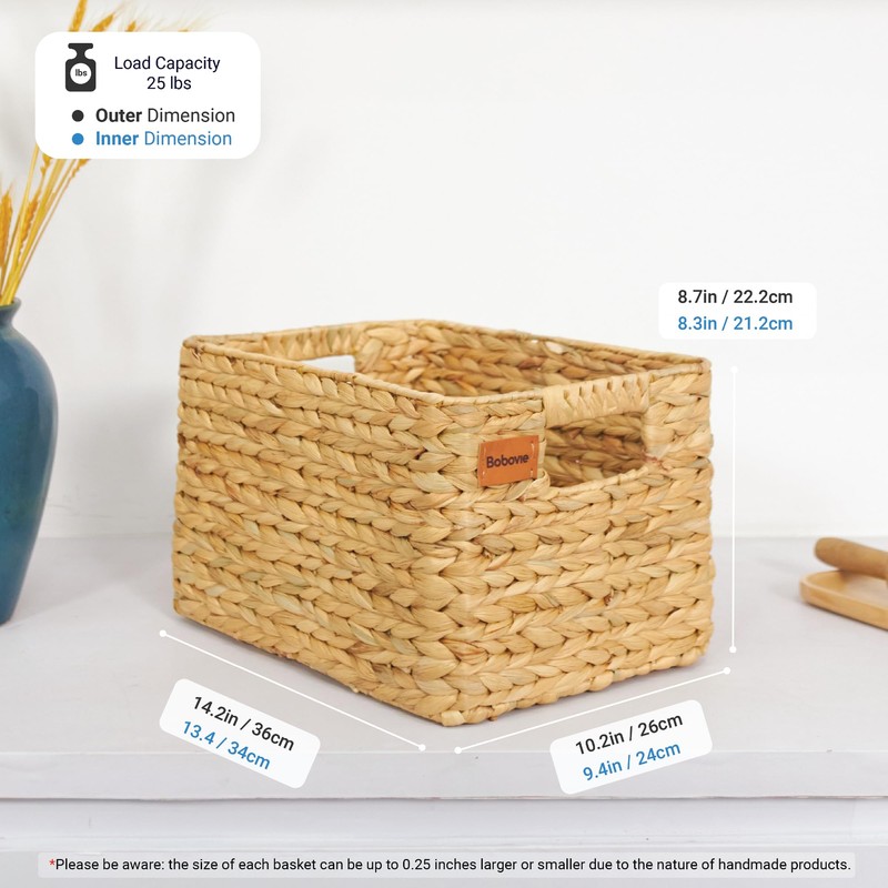 - [Versatile Basket Storage Solution] Our Bobovie water hyacinth storage baskets, in a set of three, are perfect for organizing any space. These large baskets for storage, measuring 14.2x10.2x8.7 inches, are ideal for shelves, pantries, and more.
