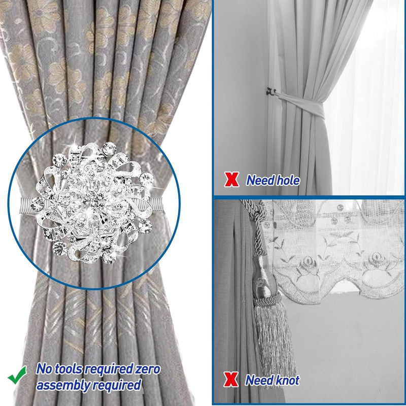 • 【PREMIUM MATERIAL】Our silver tie backs for curtains are made of high quality aluminum alloy with a very smooth, burr-free surface that will not scratch the curtains. The 304 stainless steel wire spring straps have good elasticity and not easy to break, can be easily adjusted to suit your curtains. The curtain tie back is designed in flower shape, embellished with sparkling rhinestone crystals, perfect to decorate your home room curtains.