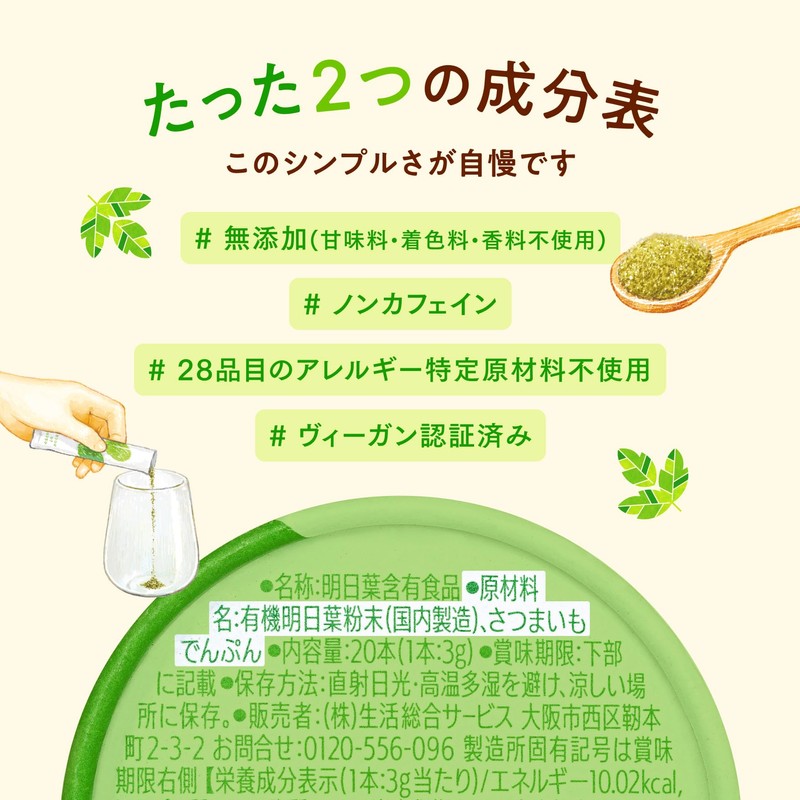 - 原材料:有機明日葉粉末、さつまいもでんぷん(ともに国内製造、キャリーオーバーなし)