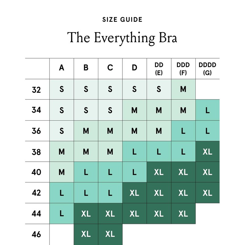 - FIND YOUR BEST FIT: Designed to flex with your changing body, The Everything Bra adapts to rib cage and cup size fluctuations during pregnancy and early breastfeeding. If you're pregnant and between sizes (on the cusp), we recommend you choose the larger size to allow for growing comfort. If you’re 0–6 months postpartum, your body is still adjusting—opt for the smaller size.
