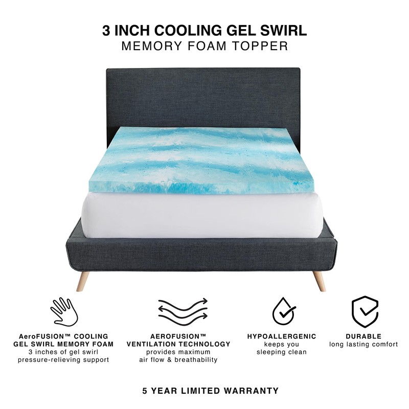 Improve the comfort of your mattress with cooling comfort and support found in the Gel Swirl Memory Foam Mattress Topper. Two inches of plush AeroFusion gel memory foam offers supportive spinal alignment to relieve pressure points, while ventilation technology provides maximum air flow and temperature regulation. Swirls of cooling gel infused in the foam helps to promote heat dissipation so you can enjoy cooler sleep throughout the night. The odor free memory foam meets CertiPUR-US standards for content, emissions, and durability for long lasting comfort. Each gel swirl mattress topper is backed by a 5-year limited warranty.
