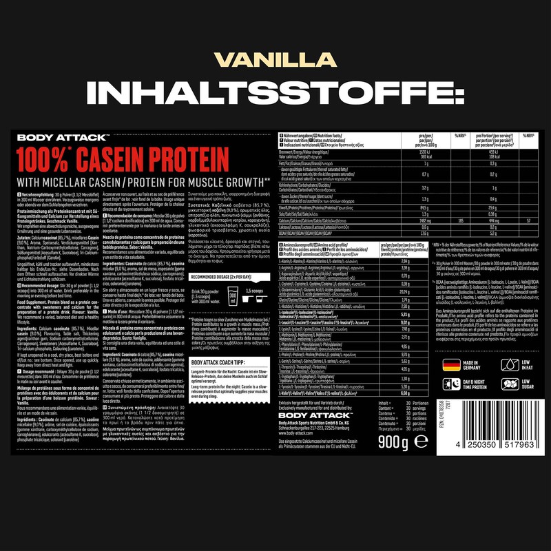 • ? CREMIG: Selbst in Wasser! Das BODY ATTACK 100% Casein Protein bieten wir dir in leckeren Sorten wie den Klassikern Vanille, Erdbeere und Schokolade oder aber Peach Mascarpone und Cookies & Cream.