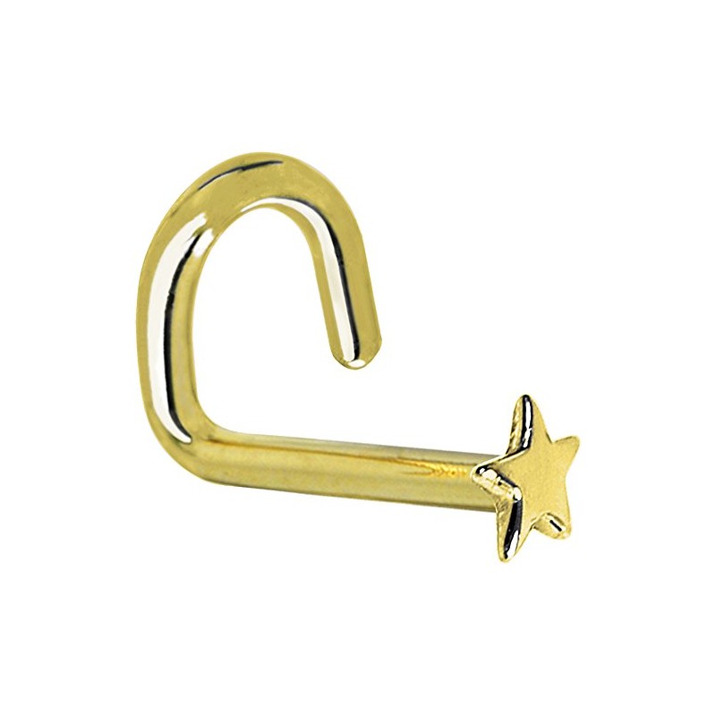 Shine like a star with this handmade 18 gauge star nose ring designed in 14K yellow gold with a 2.7mm star. Solid gold flat star nose ring. Specifications: 18 Gauge (1mm), 1/4" (6mm) Length, Solid 14k Gold, 2.7mm Star, Hand Assembled in USA, Hand polished