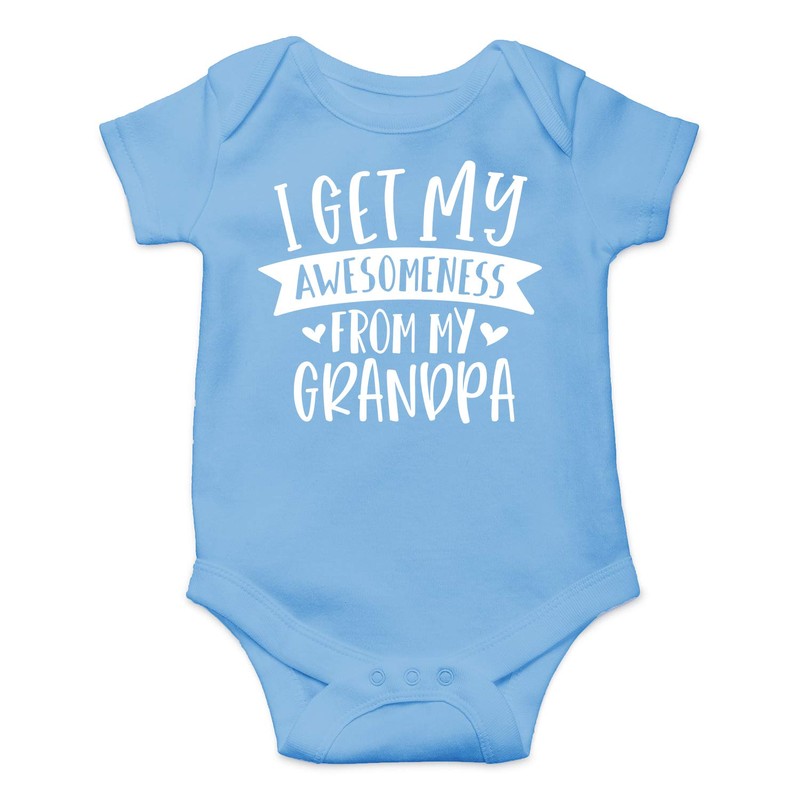 - Deja que tu pequeño paquete de alegría se vea el más lindo en este body para bebé con texto "I Get My Awesomeness From My Grandpa". Este divertido diseño de Funnwear hará que todos los amigos y familias disfruten de una buena risa juntos.