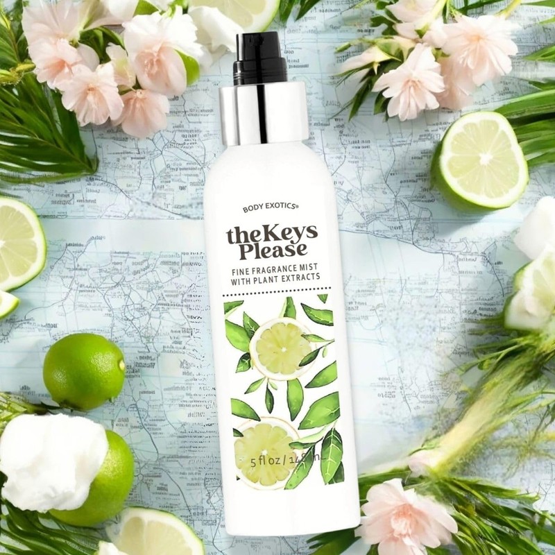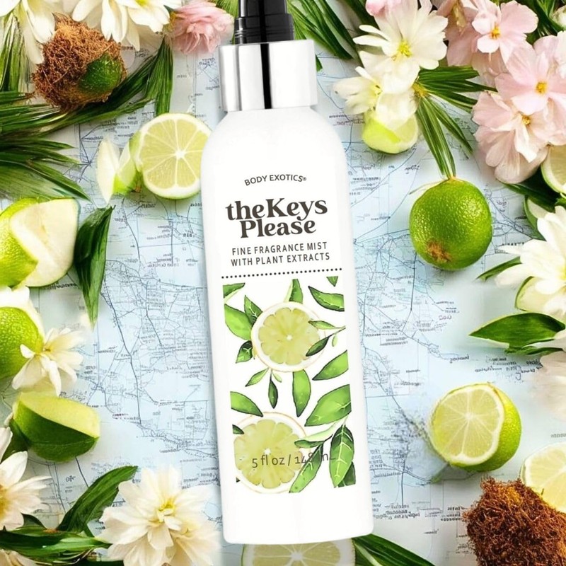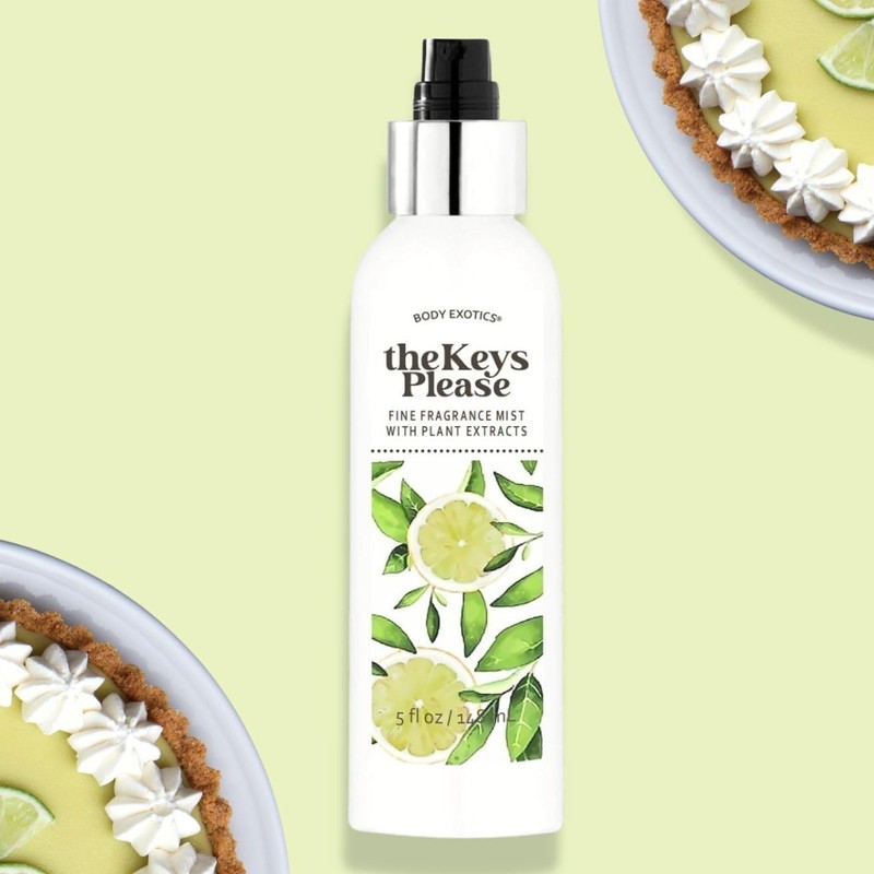 - New Scent! The Keys Please ALCOHOL-FREE Fragrance Mist by Body Exotics - an Irresistible Fusion of Coconut Milk & Shavings, Sweet Orange, Juicy Key Lime & Creamy Vanilla - with Plant Extracts. Formulated with Botanicals and a Rare Blend of Essential and Nature-identical Fragrance Oils. Made in the USA with ethically-sourced, sustainable ingredients. Clean, Vegan & Cruelty-free.