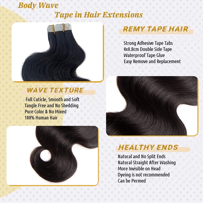 - ❤Body Wave Tape in Hair Extensions:Body Wave Straight Hair Extensions Tape in are made of 100% real human hair, the raw materials are carefully selected and the hair is perfectly protected during the procedure,non-knotted, non-mixed with synthetic or animal hair. The remy hair can remain ultra-soft, shiny, silky, and tangle-free throughout its lifetime.