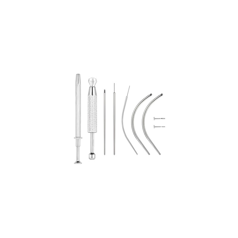 Piercing tools set: for screwing on in jewellery style piercing taper, threadless insertion pin, press straight piercing taper, press in curved piercing taper.