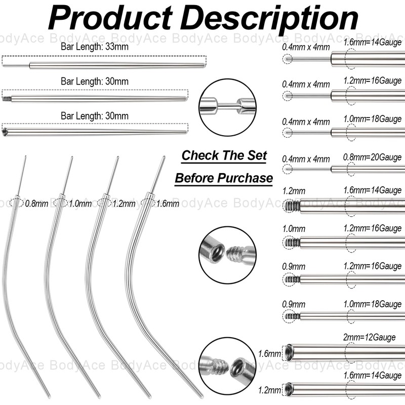 - Piercing tools size: piercing threader tool gauge size: 14G (1.6 mm) / 16G (1.2 mm) / 18G (1.0 mm) / 20G (0.8 mm). Please check and choose the desired style. The edges of the insertion pins taper are smoothly polished, do not hurt the skin. Body piercing stretching kit easy to use, preferred tools for wearing piercing jewellery.