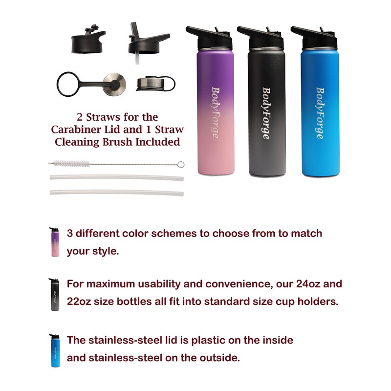 - Each bottle includes three leak-proof lids—Carabiner Straw Lid with two straws, Flip Lid, and Stainless-Steel Lid—and is crafted from 18/8 premium stainless steel that's BPA-free and ensures no metallic taste or rust.