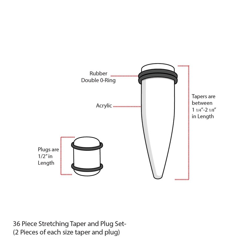 - Acrylic Tapers (1 Pair of each Size): 14G (1.6mm), 12G (2mm), 10G (2.5mm), 8G (3.2mm), 6G (4mm), 4G (5mm), 2G (6mm), 0G (8mm), 00G (10mm).