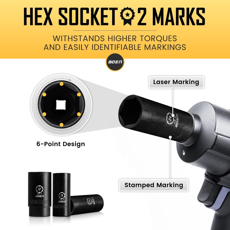 - ✅【DURABLE & LASER MARKING】 Different from the traditional black oxide coating, BOEN impact socket set 1/2 dirve adopts black manganese phosphate coating to provide excellent corrosion resistance and rust resistance for long-term use. Laser markings make all model numbers easy to keep, read and quick identification.