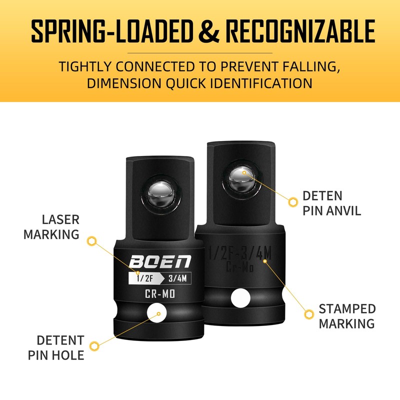 - 【DURABLE & LASER MARKING】 Different from the traditional black oxide coating, BOEN impact socket adapter adopts black manganese phosphate coating to provide excellent corrosion resistance and rust resistance for long-term use. Laser markings make model numbers easy to keep, read and quick identification.