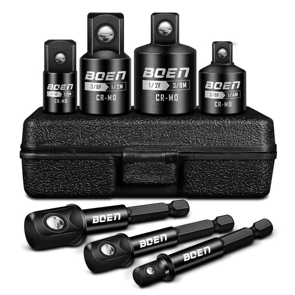 BOEN 7 Pieces Impact Socket Adapter and Reducer Set, 1/4" & 3/8" & 1/2" Drive Socket Adapter Set and 1/4" Drive SAE Hex Shank with Storage Case