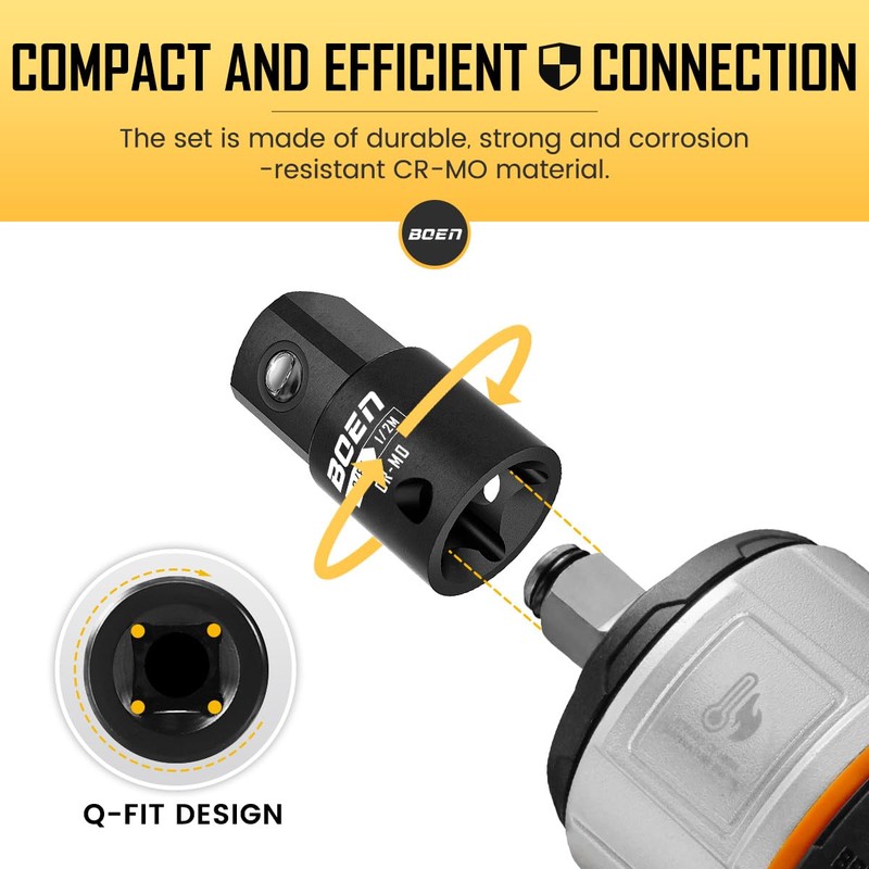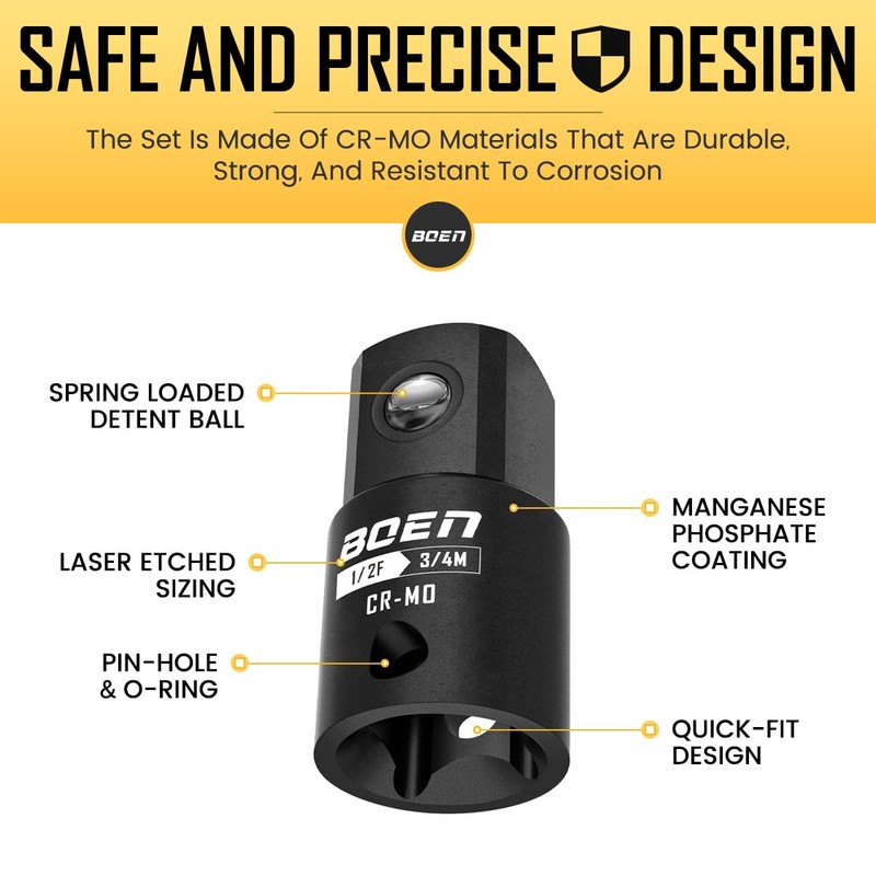 - Rust-Free & Ready for Action: While some socket reducers corrode over time, BOEN’s adapters are coated with a premium corrosion-resistant black oxide finish, offering excellent protection against rust. This ensures that your tools stay in optimal condition, even after heavy use in challenging environments
